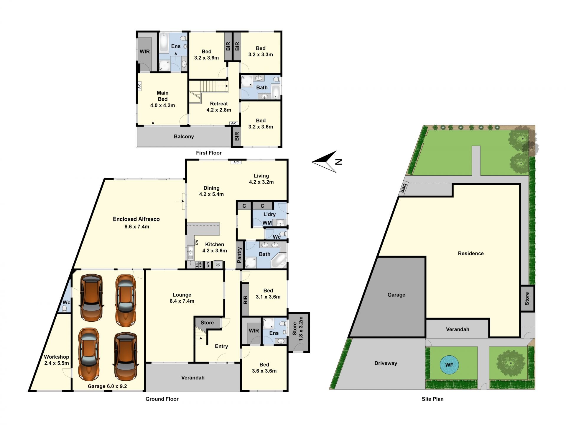 Upstairs adds another master suite, three further bedrooms, a retreat or study area, and a central bathroom.
