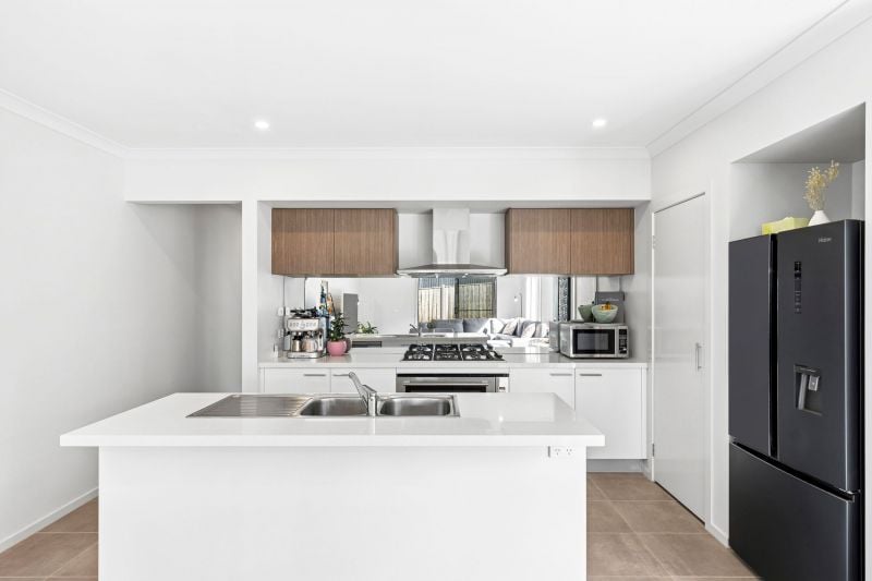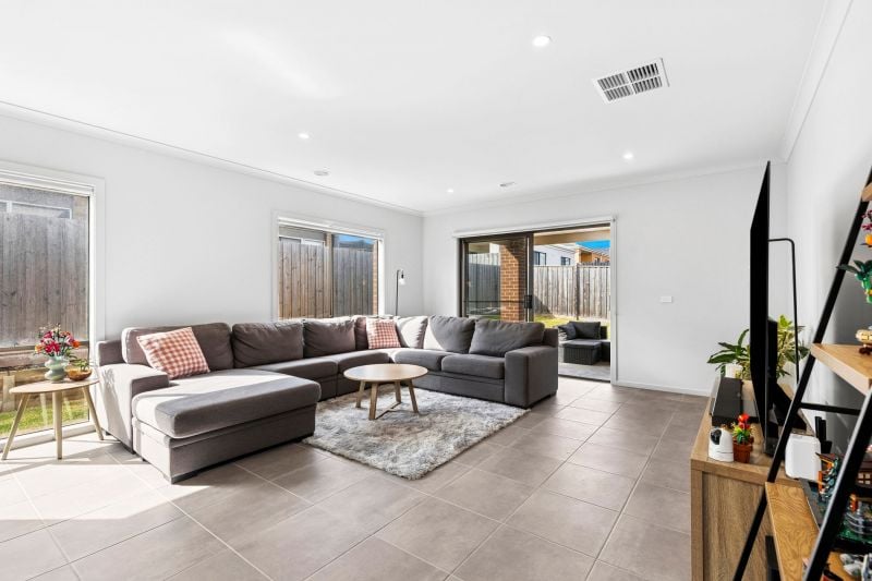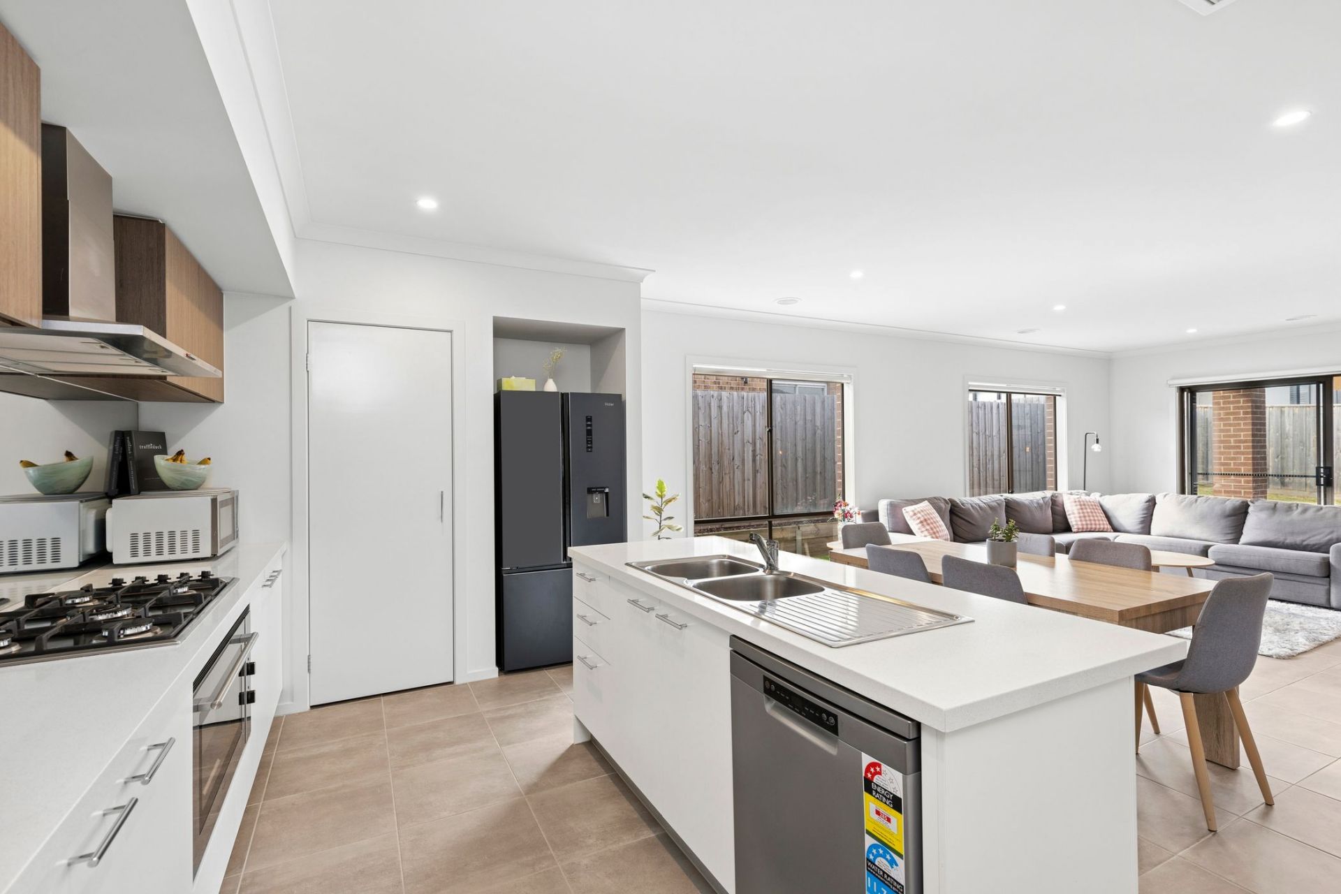 Walk through the front door and immediately appreciate the spacious second living room to your right, bathed in beautiful north-facing light. This inviting space is perfect for relaxing, unwinding, or creating a formal lounge separate from the main living area. Moving further in, the heart of the home unfolds into the open-plan kitchen, living, and dining area. Tiled throughout for easy maintenance, this space is designed for both comfort and connection. The well-appointed kitchen features stone benchtops, a five-burner Haier cooktop, built-in oven, rangehood, and dishwasher. A mirrored splashback enhances the sense of space, while the built-in pantry provides ample storage. The kitchen flows effortlessly into the dining, living, and undercover outdoor areas, creating a seamless space for entertaining or relaxed family living.