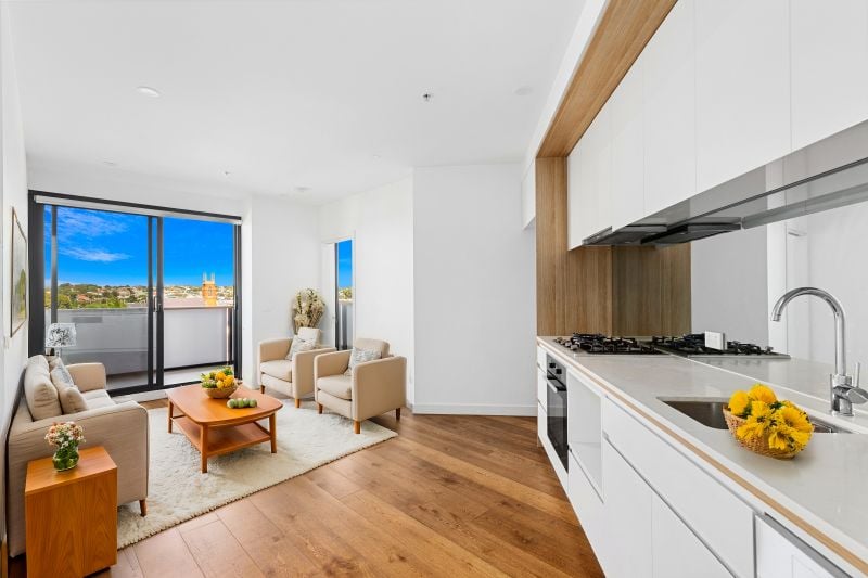 The kitchen showcases premium stone benchtops and stainless-steel appliances, while the two bathrooms feature exquisite floor-to-ceiling tiles and top-tier cabinetry, fixtures, and fittings residents can enjoy a generous communal balcony-ideal for hosting barbecues against the backdrop of panoramic bay views-as well as a gym conveniently located on the third floor, included within the Owners Corporation. Additional conveniences include a European laundry and a dedicated parking space in the secure garage.