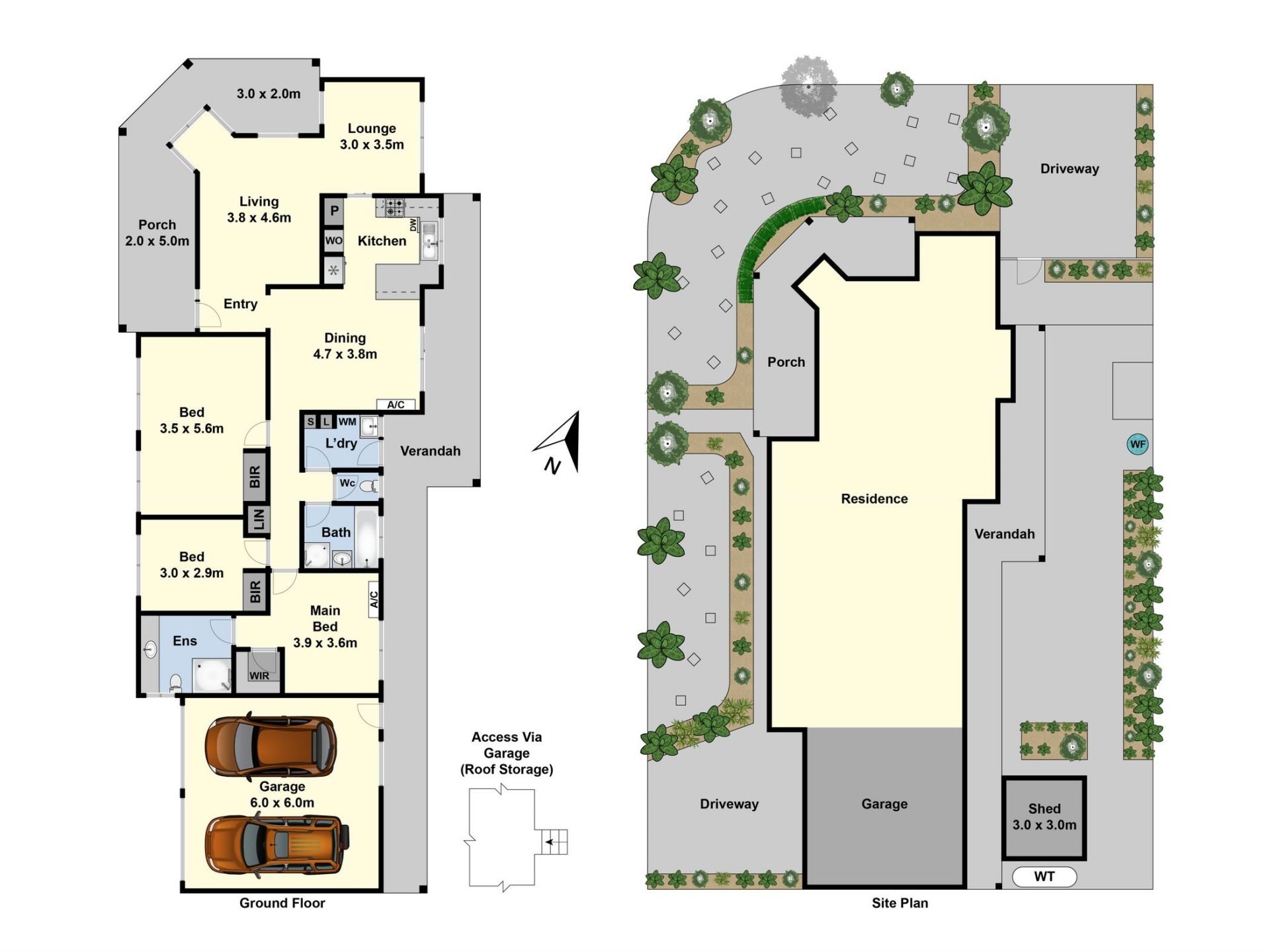 Additional highlights include a security system, a 3x3m powered shed, and a 3000L water tank for garden maintenance. The double garage offers attic storage, ideal for stowing away seasonal items, with two double driveways providing ample parking for multiple vehicles, boat or caravan.